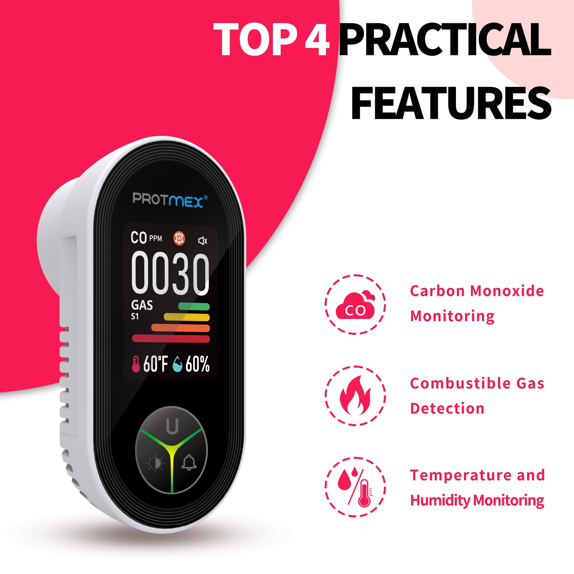 Protmex Carbon Monoxide Detector Plug in Wall, 3-in-1 Co Detector Monitor Air Quality with Temperature Humidity Sensor, Portable CO Meter Easy to Read & Install, for Home/Hotel/RV